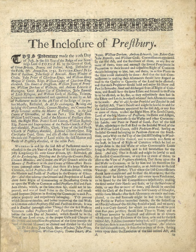 We were recently made aware by Gloucestershire Archives of a volume which included some enclosure maps of Prestbury dated 1731, which was going to auction. This was a very exciting discovery with great potential to fill in many of the missing details relating to early land ownership in Prestbury.